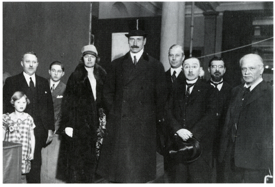 Lilly, Lars Peter og Otto Petersen i selskab med Dronning Alexandrine og Kong Christian X ved udstillingen i Industribygningen i København 7.-15. marts 1925. Yderst til højre er det opfinderen Valdemar Poulsen